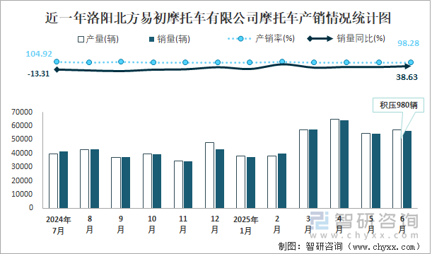 2025年6月洛阳北方易初摩托车有限公司摩托车产销量分别为57077辆和56097辆 产销率为98.28%