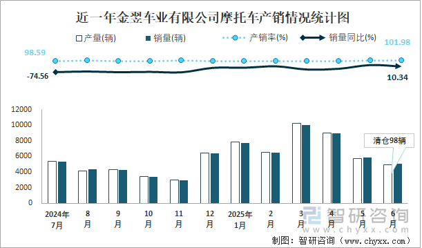 2025年6月金翌车业有限公司摩托车产销量分别为4960辆和5058辆 产销率为101.98%