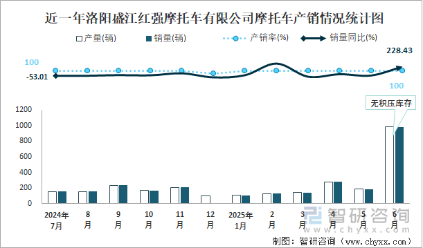 2025年6月洛阳盛江红强摩托车有限公司摩托车产销量分别为982辆和982辆 产销率为100%