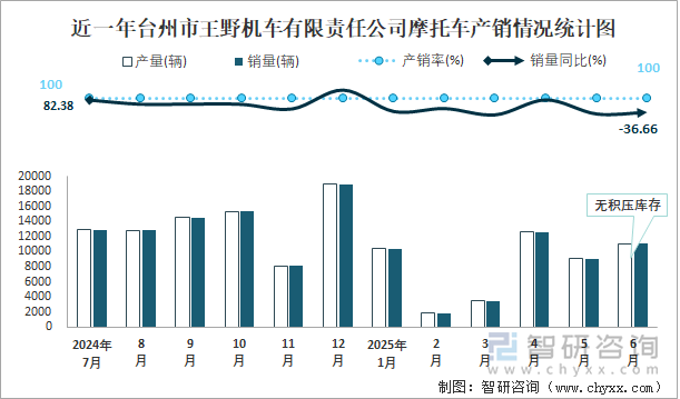 2025年6月台州市王野机车有限责任公司摩托车产销量分别为11076辆和11076辆 产销率为100%