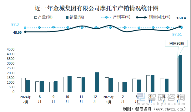 2025年6月金城集团有限公司摩托车产销量分别为4012辆和3916辆 产销率为97.61%