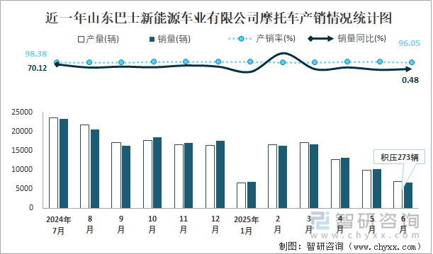 2025年6月山东巴士新能源车业有限公司摩托车产销量分别为6904辆和6631辆 产销率为96.05%