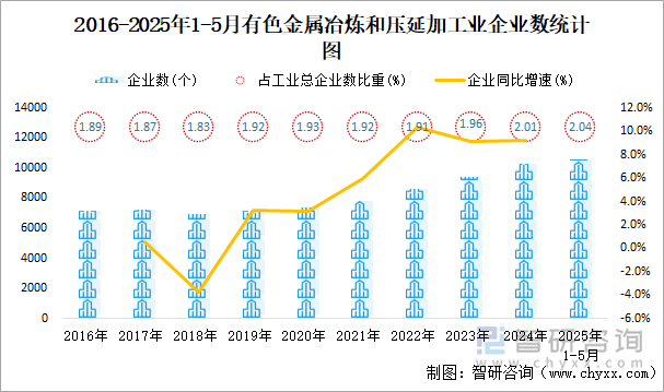 2025年1-5月有色金属冶炼和压延加工业企业有10611个,同比增长6.43%