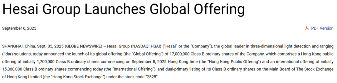 全球发售安排 - 香港公开发售初始发行170万股B类普通股 于9月8日启动 [2] - 国际发售初始发行1530万股B类普通股 于今日启动 [2] - 香港发售价格最高为每股228港元或29.04美元 [3] - B类普通股将在香港联交所主板双重主要上市 股票代码2525 [2] - 美国存托股份继续在纳斯达克上市 每股ADS代表一股B类普通股 [2] - 香港上市B类普通股与纳斯达克ADS将实现完全可互换 [2] 基石投资者与资金用途 - 与高瓴旗下HHLR Advisors 泰康人寿等6家机构签署基石投资协议 [4] - 募集资金将用于研发投资 业务发展及补充营运资金 [4] 公司业务与市场地位 - 公司专注激光雷达研发与制造 专利成果遍布全球 [4] - 以高清三维感知技术赋能智能驾驶和机器人应用 [4] - 激光雷达出货量全球领先 [4] - 与禾赛科技 速腾聚创 华为等企业占据市场主导地位 [5] - 已与24家国内外汽车厂商达成量产定点合作关系 [5] - 新增9家头部车企的20款车型定点 量产周期覆盖至2026年 [5] 财务与运营表现 - 2025年第二季度实现营收7.06亿元 同比增长53.9% [5] - 第二季度净利润4410万元 同比实现扭亏为盈 [5] - 第二季度激光雷达总交付量35.2万台 同比增长306.9% [5] - 其中ADAS产品交付量30.4万台 同比增长275.8% [5] - 2025年上半年总交付量54.8万台 同比增长276.2% 已超2024年全年 [5] 行业发展趋势 - 新能源汽车渗透率持续提升 产业变革进入智能化下半场 [4] - 激光雷达成为智能汽车的安全标配 [4] - 2024年国内激光雷达装机量突破150万颗 同比增长179.7% [4] - 2025年上半年装机量达100.2万颗 同比增长71% [4] - 2025年全年装机量有望冲击250万颗 [4] 客户与合作进展 - 禾赛ATX获得比亚迪 奇瑞等12家国内头部车企几十款车型定点 [5] - 于2025年第一季度启动大规模量产 [5] - 核心客户包括Top2客户之一 吉利 长城汽车 长安汽车等头部车企 [5]