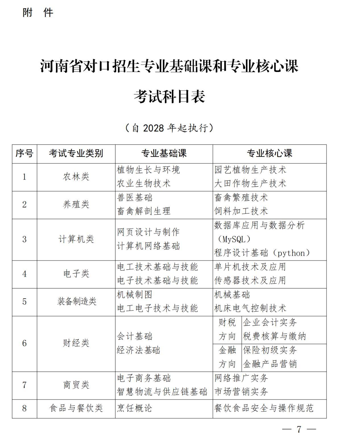 结合河南省中职专业设置情况、往年招生报名情况及在校生规模,对20个考试专业类别、55门专业课课程内容进行修订,具体考试科目如下: 记者从河南省教育厅了解到,河南决定对全省普通高等学校对口招收中等职业学校毕业生(以下简称"对口招生")的专业基础课和专业核心课考试科目进行 调整。 (自 2028年起执行) | 序号 | 考试专业类别 | 专业基础课 | 专业核心课 | | --- | --- | --- | --- | | 1 | 农林类 | 植物生长与环境 | 园艺植物生产技术 | | | | 农业生物技术 | 大田作物生产技术 | | 2 | 养殖类 | 兽医基础 | 畜禽繁殖技术 | | | | 畜禽解剖生理 | 饲料加工技术 | | 3 | 计算机类 | 网页设计与制作 | 数据库应用与数据分析 | | | | 计算机网络基础 | (MySQL) | | | | | 程序设计基础(python) | | 4 | 电子类 | 电工技术基础与技能 | 单片机技术及应用 | | | | 电子技术基础与技能 | 传感器技术及应用 | | 5 | 装备制造类 | 机械制图 | 机械基础 | | | | 电工电子技术 ...