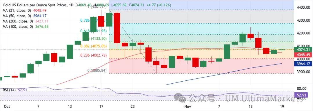 黄金价格走势 - 金价在周三早盘于4100美元下方盘整,买家在强劲反弹后稍作喘息 [1][3] - 周二金价结束连续三日下跌出现强势反弹,重新回到21日均线上方 [3][4] - 日线图显示金价交易于4074.30美元,维持在21日、50日、100日和200日等所有关键简单移动平均线之上,技术面保持看涨偏向 [9] 市场驱动因素 - 全球市场抛售引发对黄金的避险需求,担忧源于科技行业人工智能驱动的高估值及美国就业数据不佳 [4] - 美国失业救济人数在9月中旬至10月中旬激增,同时ADP报告显示私营企业在截至11月1日的四周内平均每周失去2500个工作岗位 [4] - 市场关注美联储10月货币政策会议纪要及即将公布的9月非农就业数据,以寻找美联储下一步政策线索 [3][5][6] 关键技术指标 - 日线相对强弱指数为52.91,处于中性并略有上升 [9] - 从4381.17美元高点至3885.84美元低点的38.2%斐波那契回撤位4075.05美元构成近期阻力,突破后目标看至50%回撤位4133.50美元 [9] - 21日均线4048.49美元提供短期支撑,50日均线3964.17美元构成下方关键支撑位 [9] 宏观经济背景 - 美元在周高点附近交易,但在风险情绪改善背景下上涨空间受限 [2][5] - 根据CME集团FedWatch工具,市场预计美联储12月降息的可能性为五五开 [5] - 经济学家预计9月非农就业数据将新增5万个工作岗位,高于8月的2.2万个,该数据将为美联储降息时机提供重要线索 [6]