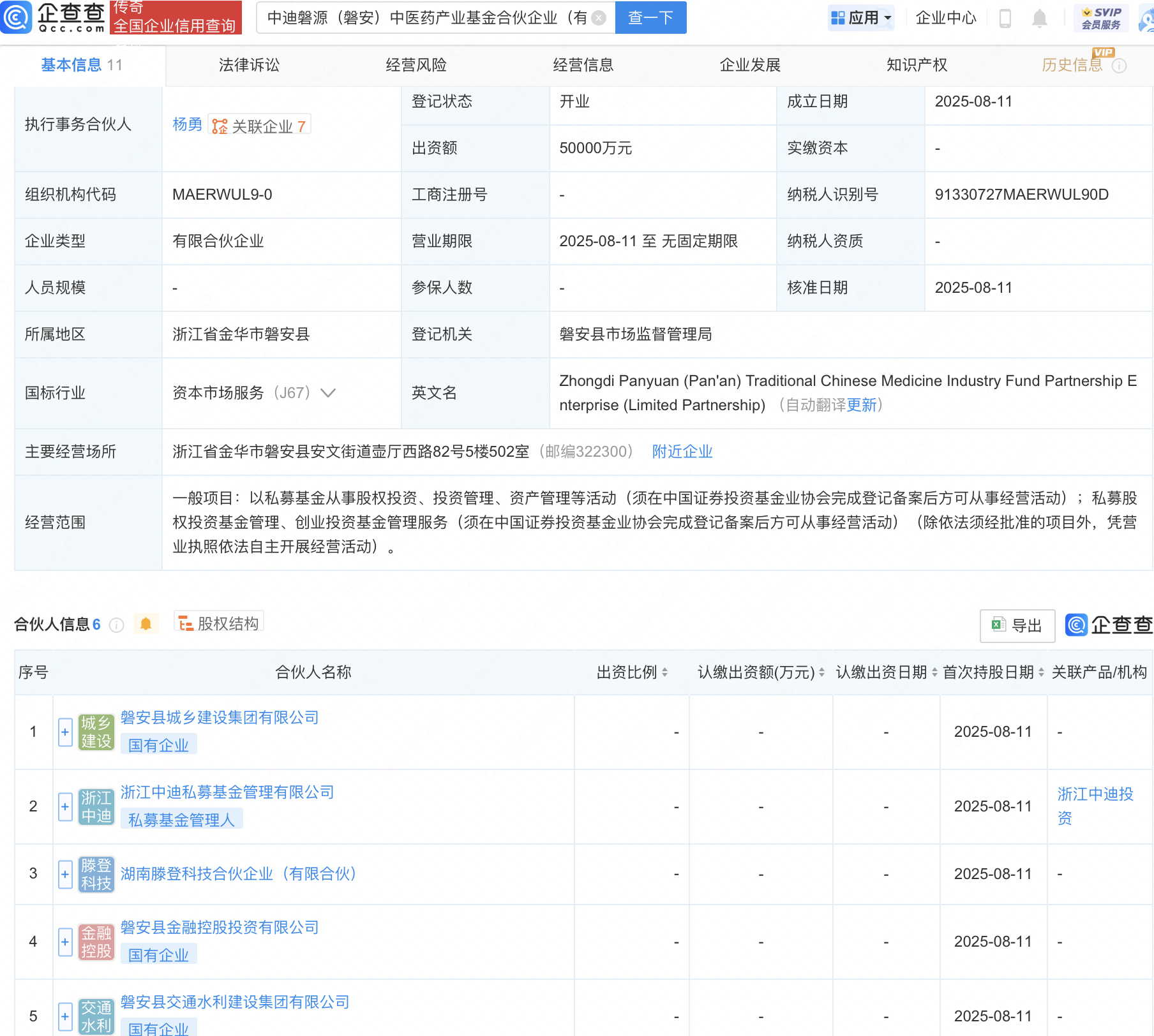 企查查APP显示,近日,中迪磐源(磐安)中医药产业基金合伙企业(有限合伙)成立,出资额5亿元,经营范围包含:以私募基金从事股权投资、投资管 理、资产管理等活动。企查查股权穿透显示,该企业由磐安县城乡建设集团有限公司等共同出资。 磐安县交通水利建设集团有限公司 交通 5 + 水利 国有企业 | 序号 | | | 合伙人名称 | 出资比例 ⇒ | | --- | --- | --- | --- | --- | | | | 城乡 | 磐安县城乡建设集团有限公司 | | | 1 | + | 建设 | 国有企业 | | | 2 | + | 浙江江 | 浙江中通私募基金管理有限公司 | | | | | 中迪 | 私募基金管理人 | | | 3 | + | 滕壹 | 湖南滕登科技合伙企业 (有限合伙) | | | ব | + | 金融 | 磐安县金融控股投资有限公司 | | | | | 控股 | 国有企业 | | | 、ド合 名 R 可 全国企业信用查询 | | 中迪磐源(磐安)中医药产业基金合伙企业(有 ▽ | 習一下 | | --- | --- | --- | --- | | 基本信息 11 | 法律诉讼 | 经营风险 ...