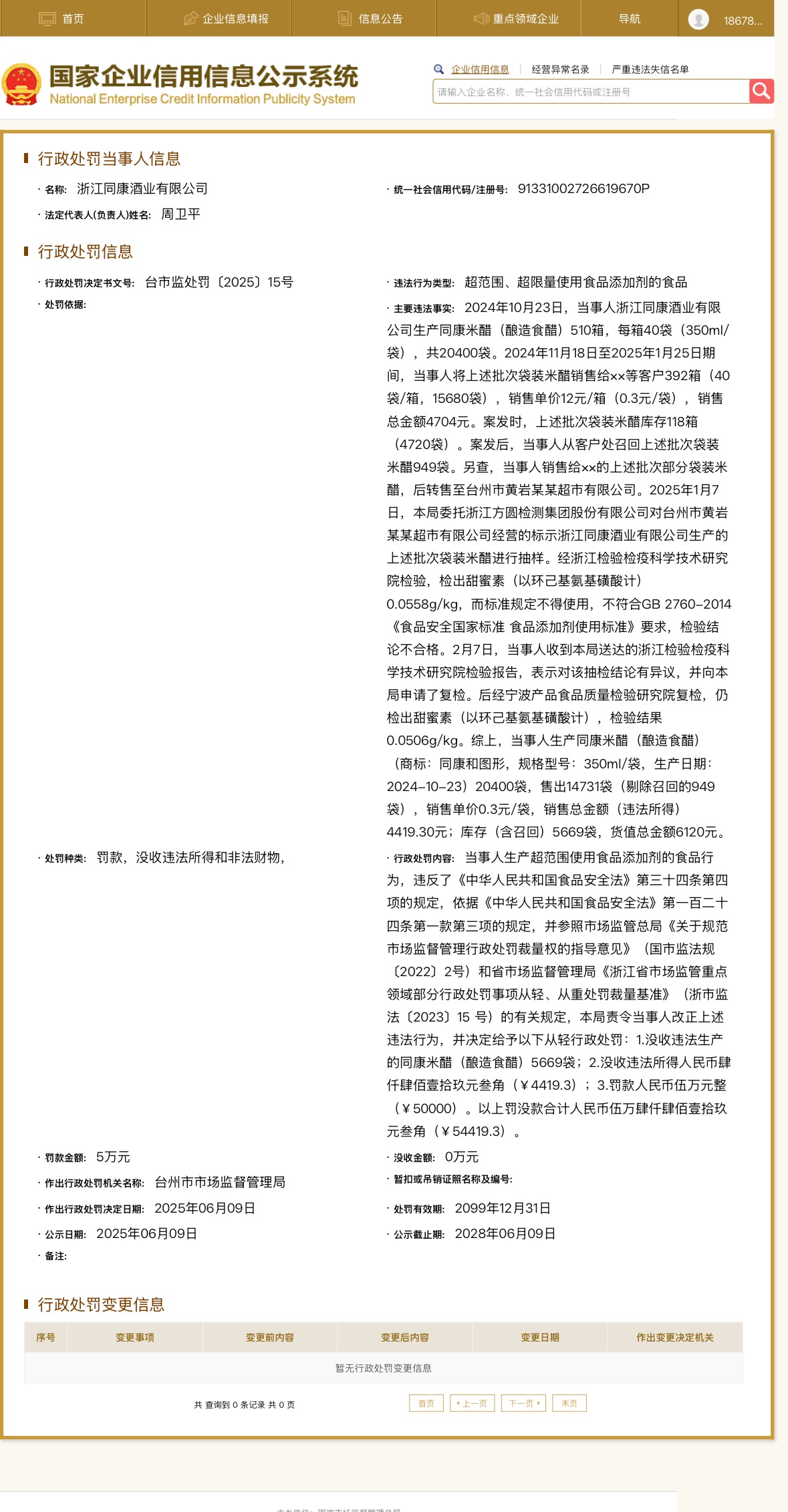 浙江同康酒业米醋检出禁用添加剂甜蜜素,被罚没5.4万余元