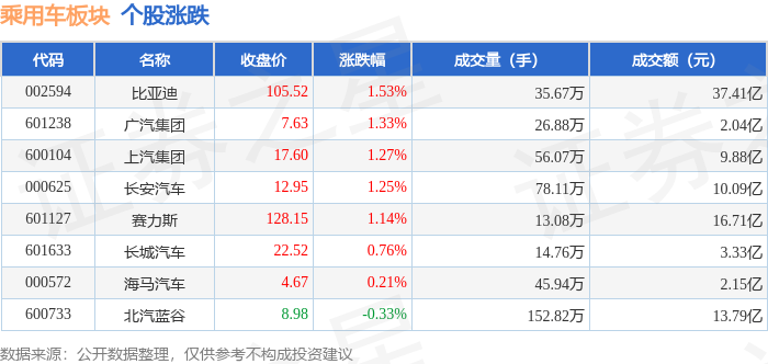 板块表现 - 乘用车板块当日上涨1.2%,领涨个股为比亚迪(涨跌幅1.53%)[1] - 上证指数上涨0.34%至3647.55点,深证成指上涨1.46%至11291.43点[1] 个股涨跌 - 比亚迪收盘价105.52元,成交量35.67万手,成交额37.41亿元[1] - 广汽集团涨1.33%至7.63元,上汽集团涨1.27%至17.60元,长安汽车涨1.25%至12.95元[1] - 赛力斯涨1.14%至128.15元,长城汽车涨0.76%至22.52元,海马汽车涨0.21%至4.67元[1] - 北汽蓝谷下跌0.33%至8.98元,成交量152.82万手为板块最高[1] 资金流向 - 板块主力资金净流入3.87亿元,游资净流出3.77亿元,散户净流出923.46万元[1] - 比亚迪主力净流入2.64亿元(占比7.07%),游资净流出2.53亿元[1] - 赛力斯主力净流入1.16亿元(占比6.96%),长安汽车主力净流入8158.2万元(占比8.09%)[1] - 北汽蓝谷主力净流出6974.28万元(占比-5.06%),长城汽车主力净流出3536.94万元(占比-10.63%)[1] 相关ETF - A50ETF(159601)跟踪MSCI中国A50指数,近五日上涨1.14%[5] - 最新份额33.4亿份,减少4940万份,主力资金净流入113.5万元[5]