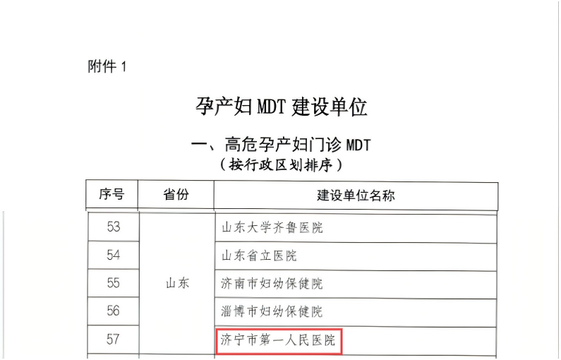 近日,国家卫生健康委妇幼司下发《国家卫生健康委妇幼司关于确定孕产妇多学科协作诊疗和产科亚专科建设单位的通知》(国 卫妇幼妇卫便函[2025]35号),济宁市第一人民医院被确定为"高危孕产妇门诊MDT"建设单位,全省仅3家综合医院获批;同时获 批"妊娠期代谢性疾病亚专科""胎盘疾病亚专科""早产亚专科""产科重症亚专科""胎儿医学亚专科"5个产科亚专科建设单位,全 省仅6家医院获批。 | 序号 | 常保 | 建设单位名称 | | --- | --- | --- | | 53 | | 山东大学齐鲁医院 | | Ed | | 山东省立医院 | | 55 | 山东 | 济南市妇幼保健院 | | 56 | | 淄博市妇幼保健院 | | 57 | | 济宁市第一人民医院 | | 序号 | स्त्र सिर | 建设单位名称 | | --- | --- | --- | | 50 | | 山东省妇幼保健院 | | 51 | | 济南市妇幼保健院 | | 52 | 山东 | 济宁市第一人民医院 | | ਦਿੱਤੇ | | 潍坊市妇幼保健院 | | 54 | | 聊城市东昌府区妇幼保健院 | 三、胎盘疾病亚专科 (按行政区划排 ...