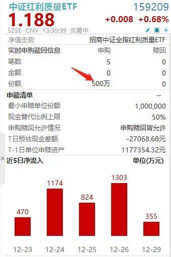 A股市场持续走强,"质量红利"策略成为资金追逐的亮点。截至12月30日下午13时20分,中证红利质量 ETF(159209)上涨0.51%,其成分股世茂能源强势涨停,云铝股份等纷纷跟涨。该基金年内涨幅已近 20%,领跑A股所有红利类ETF,同时更获资金连续12个交易日净流入,市场热度持续高涨。 分析指出,当市场风险偏好上行,投资者寻求更具弹性的配置工具。中证红利质量指数融合"高股 息"与"高质量"双因子,精准捕捉机遇。其不仅聚焦稳定分红企业,更严选盈利能力强、财务稳健、具 备成长性的优质公司。在积极市场环境中,此类标的凭借扎实基本面和增长潜力,更易吸引资金集中配 置,往往展现出超越单纯高股息策略的股价弹性与上行空间。该指数为布局风险偏好上行期提供了攻守 兼备的优质选择。产品设计层面,中证红利质量ETF(159209)费用模式采用"0.15%+0.05%"的全市场最 低档 ,长期持有具备明显的成本优势;分红模式采用月度评估分红机制,能更好地满足投资者的现金 流需求,提升持有体验。 风险提示:基金有风险,投资需谨慎。 | 中证红利质量ETF | | 159209 | | | --- | --- | --- | - ...
