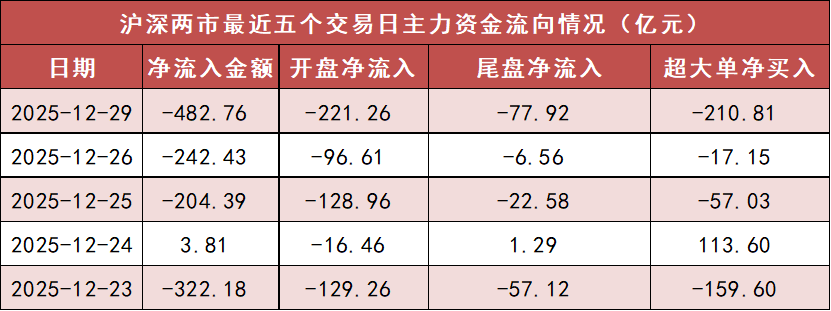 市场指数与成交概况 - 2025年12月29日,上证指数收盘报3965.28点,微涨0.04% [1] - 深证成指收盘报13537.1点,下跌0.49%;创业板指收盘报3222.61点,下跌0.66% [1] - 两市合计成交额为21393.38亿元,较上一交易日减少208.54亿元 [1] 主力资金整体流向 - 沪深两市全天主力资金净流出482.76亿元 [2] - 主力资金开盘净流出221.26亿元,尾盘净流出77.92亿元 [2] - 超大单全天净卖出210.81亿元 [2] - 最近五个交易日(12月23日至29日),主力资金仅在12月24日实现净流入3.81亿元,其余四个交易日均为净流出,其中12月29日净流出额最大 [2] 主要板块资金流向 - 沪深300指数成分股主力资金净流出142.73亿元 [3] - 创业板主力资金净流出183.32亿元 [3] - 科创板主力资金净流出21.17亿元 [4] - 从尾盘资金看,沪深300、创业板、科创板分别净流出23.75亿元、19.37亿元和4.01亿元 [4] 行业资金流向 - 银行行业涨幅0.53%,主力资金净流入29.83亿元,为净流入最多的行业,资金主要流入农业银行等个股 [5] - 石油石化行业涨幅0.74%,主力资金净流入9.63亿元,资金主要流入中国石化 [5] - 煤炭行业下跌0.24%,主力资金微幅净流入0.21亿元,资金主要流入中国神华 [5] - 电力设备行业下跌0.62%,主力资金净流出156.07亿元,为净流出最多的行业,资金主要流出宇德时代等个股 [5] - 有色金属行业下跌0.82%,主力资金净流出97.25亿元,资金主要流出洛阳辑业等个股 [5] - 医药生物行业下跌0.98%,主力资金净流出77.80亿元,资金主要流出美年健康等个股 [5] 机构龙虎榜动态 - 天际股份上涨0.40%,获机构净买入16828.54万元,为净买入额最高的个股 [8] - 佳缘科技大跌11.57%,仍获机构净买入10199.67万元 [8] - 英飞特、天奇股份、步科股份、迈为股份、恒勃股份均涨停(涨幅20.00%或10.02%),分别获机构净买入8559.56万元、6580.35万元、5757.90万元、4617.04万元和3085.03万元 [8] - 金风科技涨停(涨10.01%),遭机构净卖出37401.82万元,为净卖出额最高的个股 [8] - 通宇通讯、航天发展、广联航空、华菱线缆、雷科防务等个股也遭遇机构大额净卖出 [8] 机构最新关注个股 - 国投证券给予晶品特装“买入”评级,目标价114元,较最新收盘价79.71元有43.02%的上涨空间 [10] - 华泰证券给予百龙创园“买入”评级,目标价28元,较最新价21.72元有28.91%的上涨空间 [10] - 华泰证券给予环旭电子“买入”评级,目标价39.6元,较最新价29.32元有35.06%的上涨空间 [10] - 华创证券给予安克创新“强推”评级,目标价145元,较最新价111.52元有30.02%的上涨空间 [10] - 华创证券给予思特威-W“强推”评级,目标价124.5元,较最新价94.98元有31.08%的上涨空间 [10] - 国泰海通给予宁波银行“增持”评级,目标价38.89元,较最新价28.06元有38.60%的上涨空间 [10] - 广发证券给予杰瑞股份“买入”评级,目标价78.72元,较最新价74.56元有5.58%的上涨空间 [10]