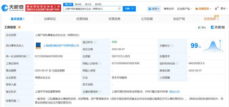 天眼查显示,近日,上海产创私募基金合伙企业(有限合伙)成立,出资额约58.01亿人民币,经营范围为以私募基金从事 股权投资、投资管理、资产管理等活动。合伙人信息显示,该基金由上海国际集团资产经营有限公司、上海浦东引领区投 资中心(有限合伙)、上海国际集团有限公司、上海国经投资发展有限公司共同出资。 | | OVNEJ 都在用的商业查询工具 | 而古板: 面关系 而风险 | | | | | | | --- | --- | --- | --- | --- | --- | --- | --- | | | 150年小企业发展子重合植 制构 | 上海产创队幕基金合伙企业(有限合伙) | 0 天殿一下 | 脂 应用 · | | 商务合作 企业级产品, 数开通公员 · | ,米斯 · | | 基本信息 6 | 法律诉讼 | 经营风险 | 经营信息 | 公司发展 | 知识产权 | | 历史信息() | | 工商信息 ● | | | | | | 用 导 | 7天眼直 | | 企业名称 | 上海产创私募基金合伙企业(有限合伙) | | | | | | | | 执行事务合伙人 | 上海国际集团资产经营有限公司 | 登记状态() | ...