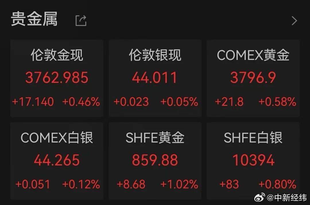 | 贵金属 | [G | | | | --- | --- | --- | --- | | 伦敦金现 | 伦敦银现 | COMEX黄金 | | | 3796.9 | 3762.985 | 44.011 | | | +17.140 +0.46% +0.023 +0.05% +21.8 +0.58% | | | | | COMEX自银 | SHFE自银 | SHFE黄金 | | | 44.265 | 859.88 | 10394 | | | +8.68 +1.02% | +83 +0.80% | +0.051 +0.12% | 6 @中新经纬 | 【#金价继续涨##黄金持续创新高#】当地时间9月23日,国际贵金属期货普遍收涨。COMEX黄金期货涨0.58%报3796.9美元/盎司,盘中一度涨至3824.60美 元/盎司创盘中历史新高,现货黄金日内一度升破3790美元/盎司,刷新历史新高,不过在美联储主席鲍威尔发表讲话后,涨幅收窄,最终日内涨幅为 0.46%。(综合中国证券报) ...