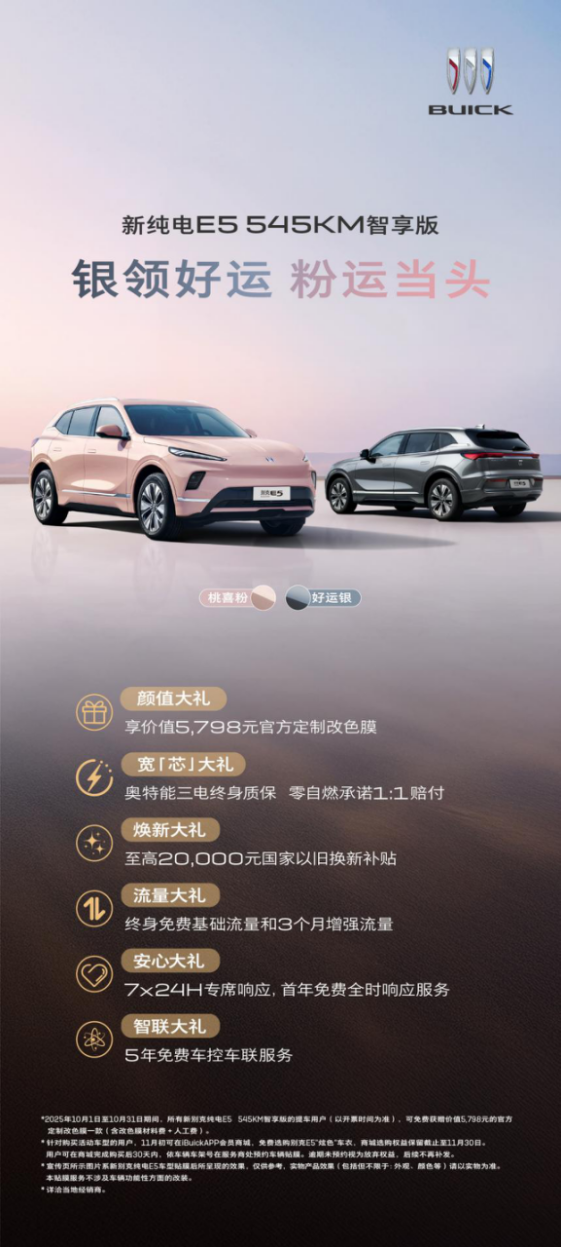 齐鲁晚报·齐鲁壹点 吴海云 正值国庆、中秋双节来临,别克品牌推出购车重磅福利:购买别克纯电E5先享版,可在14.99万元一口价基础上,叠加至高"15 倍 超级膨胀金"限时福利——1,000元定金抵扣15,000元,实际入手价低至13.59万元,让消费者用紧凑型纯电车的预算就能拥有中大型 SUV越级体验;同时选购别克纯电E5智享版,可限时免费获赠售价5,798元的"好运银"或"桃喜粉"限量版炫色车衣,兼顾个性化审 美与美好寓意*。此外,所有版本均享受奥特能三电系统终身质保、零自燃承诺1:1赔付、5年免费车控车联服务等安心保障,还可 叠加至高2万元置换补贴。别克纯电E5真正从用户核心需求出发,以实打实的权益降低购车与用车成本,为消费者提供高品质纯电 出行解决方案。 别克纯电E5推出重磅福利:15倍超级膨胀金+免费限量炫色车衣双重惊喜 炫色车衣时尚"换装" 诠释个性化出行美学 当下,车身色彩已成为用户展现个性审美的重要载体。此次别克纯电E5推出的两款炫色车衣,以时尚视觉语言升级整车气质,为 纯电出行提供更多样化的风格选择。其中,"好运银"采用内敛华丽的金属质感银色,在不同光线下熠熠生辉,诠释现代简约美 学;更蕴含" ...