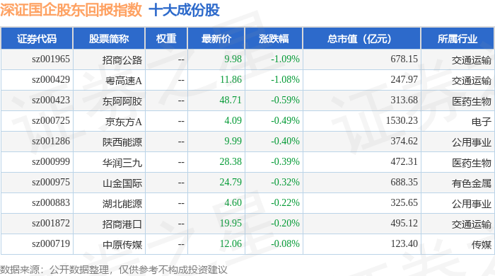 证券之星消息,12月19日,深证国企股东回报(970064)指数报收于1634.04点,涨0.98%,成交202.99 亿元,换手率0.82%。当日该指数成份股中,上涨的有39家,云铝股份以6.48%的涨幅领涨,下跌的有10 家,招商公路以1.09%的跌幅领跌。 | 代码 | 名称 | 主力净流入(元) | 主力净占比 游资净流入(元) | | 游资净占比 散户净流入(元) | | 散户净占比 | | --- | --- | --- | --- | --- | --- | --- | --- | | 000933 神火股份 | | 7890.41万 | 7.84% | 656.76万 | 0.65% | -8547.17万 | -8.50% | | 000878 云南铜业 | | 5698.62万 | 5.93% | -164.45万 | -0.17% | -5534.17万 | -5.76% | | 001979 招商蛇口 | | 5593.28万 | 13.50% | -5486.74万 | -13.24% | -106.54万 | -0.26% | | 000617 中油资本 | | 5438.61万 ...
