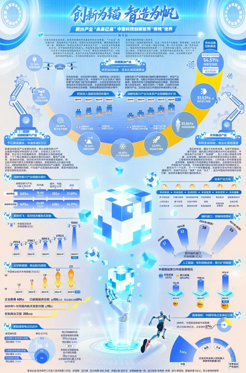 国家战略与产业方向 - “十五五”规划建议将“建设现代化产业体系,巩固壮大实体经济根基”列为战略任务第一条,并明确提出“培育壮大新兴产业和未来产业” [1] - 以战略性新兴产业为支撑、未来产业为先导的新增长极正逐步成型,旨在重塑中国经济在全球产业链与价值链中的核心竞争力 [1] 新能源发电行业 - 截至10月底,全国累计发电装机容量达37.5亿千瓦,同比增长16.5% [3] - 其中,风电和太阳能发电合计装机容量达18亿千瓦左右,占总装机容量的比重上升至46.5%左右 [3] - 太阳能发电装机容量达11.4亿千瓦,同比增长43.8% [3] - 预计到2025年底,全国发电装机容量将达到39亿千瓦左右 [3] 具身智能与人形机器人行业 - 2025年,中国具身智能市场规模预计达52.95亿元,占全球市场约27% [3] - 过去五年,全球人形机器人市场规模增长迅速 [3] 商业航天行业 - 中国在轨商业卫星数量达200余颗 [3]