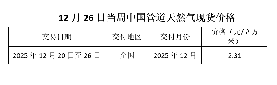 新华财经上海12月26日电 上海石油天然气交易中心26日消息,12月26日当周,在上海石油天然气交易中心成交的2025年12月交 付中国管道天然气现货价格为2.31元/立方米。 上海石油天然气交易中心每周五对外发布"中国管道天然气现货价格"的各省区市价格与全国加权平均价格,遇到节假日提前到 节假日前最后一个工作日发布。 此外,上海石油天然气交易中心还将在每月底发布"中国管道天然气现货月度均价"。 上海石油天然气交易中心是在国家发展改革委、国家能源局直接指导下,由上海市人民政府批准设立的能源交易平台,是深化 国内油气价格市场化改革的重要支撑。 (文章来源:新华财经) | 交易日期 | 交付地区 | 交付月份 | 价格(元/立方 | | --- | --- | --- | --- | | | | | 米) | | 2025 年 12 月 20 日至 26 日 | 全国 | 2025 年 12 月 | 2.31 | 据介绍,"中国管道天然气现货价格"基于上海石油天然气交易中心的管道天然气现货交易,反映的是当月或下月交付到国内各 省区市天然气长输管道起始点(交付点)的管道天然气现货的价格。 ...