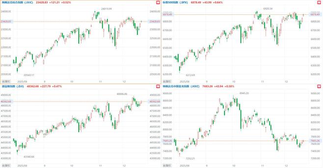 当地时间12月23日,美股三大指数集体收涨,均录得日线4连涨。纳指涨0.57%,标普500指数涨0.46%,道指涨0.16%。其中,标普500指数录得收盘新 高。 | 美股指数 | | | | --- | --- | --- | | 道琼斯 | 纳斯达克 | 标普500 | | 48442.41 | 23561.84 | 6909.79 | | +79.73 +0.16% | +133.01 +0.57% | +31.30 +0.46% | | 中国金龙 | 纳指100期货 | 标普500期货 | | 7638.99 | 25810.25 | 6958.25 | | -44.27 -0.58% | -2.00 -0.01% | -2.75 -0.04% | 铂金期货涨幅超9%,一度触及2341.90美元/盎司的历史新高。 加密货币方面,多只币种集体大跌,比特币盘中一度跌至87000美元下方,近24小时全球超8万人爆仓。 | 排名 | 而和 | 价格 | 价格(24h%) | | --- | --- | --- | --- | | 1 | B BTC | $87243.9 | -1.48% | | 2 | ET ...