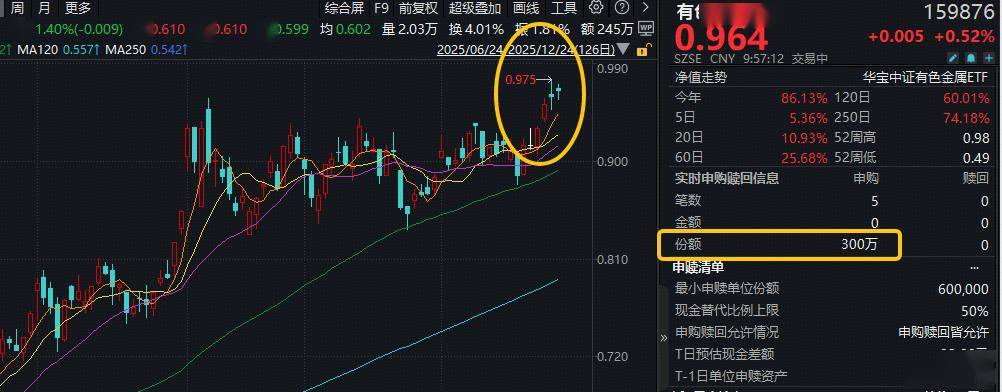 ETF盘中资讯|金、铜、锂携手创新高!后市怎么看?有色ETF华宝(159876)盘中上探1.25%,获资金实时净申购300万份!