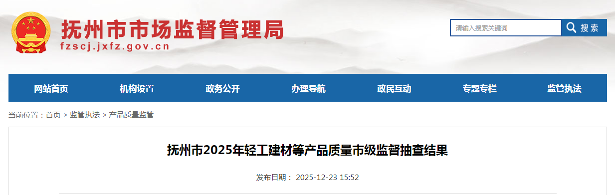 江西省抚州市2025年轻工建材等产品质量市级监督抽查结果公布