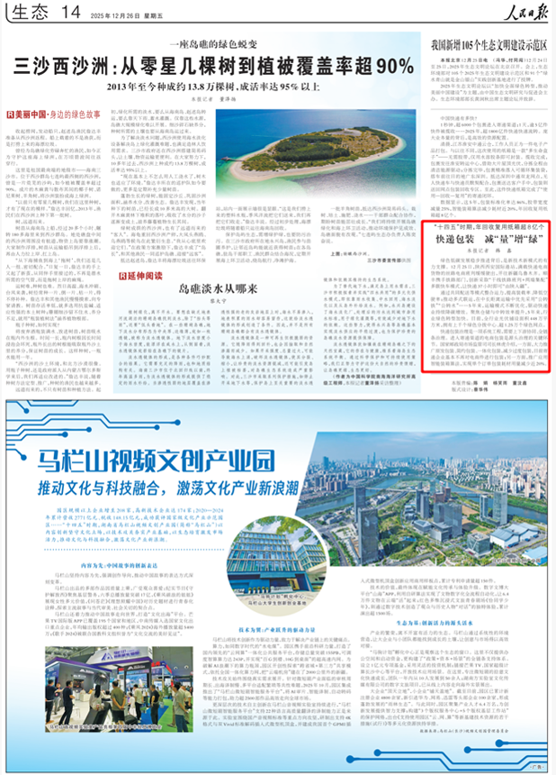 |生态 14 2025 # 12 月26 H ■■ 一座岛礁的绿色蜕变 三沙西沙洲:从零星几棵树到植被覆盖率超90% 2013年至今种成约13.8万探ł 发国新增105个生态文明建设不范 动文化与科技融合,激荡文化产业新浪演 清晨,江苏淮安中通云仓,工作人员正为一件电子产品打包。与以往不同,这次使用的纸箱是一 款"多生命盒子"——无需胶带,仅用水溶胶条即可封装。揽收完成,包裹发往淮安转运中心,借助大片 "十四五"时期,年回收复用纸箱超8亿个 快递包装 减"量"增"绿" 中国快递有多快? 1秒钟,超6000个包裹进入寄递渠道;1天,逾5亿件快件被揽收……2025年,超1800亿件快递快速 流转。庞大业务量的背后,是高效的资源配置。 屋顶光伏,分拣全程由清洁能源驱动;分拣完毕,包裹精准落入可循环集装袋,搭车前往目的地广东深 圳。抵达深圳中通双龙网点,无人快递车与快递员默契配合,包裹送达客户手中,包装则送回网点包装 回收专区。至此,这件快递纸箱完成了"使用—回收—复用"的寄递闭环。 数据显示,这5年,包装标准化率达86%,胶带宽度减量25%,智能装箱算法减少耗材近20%,年回 收复用纸箱超8亿个。 绿色低碳发展稳步 ...