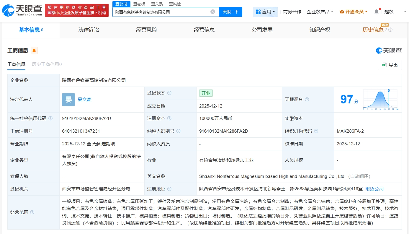 每经AI快讯,天眼查App显示,近日,陕西有色镁基高端制造有限公司成立,法定代表人为晏文豪,注册资本10亿元人民币,经营范围包括有色金属铸造、 有色金属压延加工、锻件及粉末冶金制品制造、常用有色金属冶炼等。股东信息显示,该公司由陕西有色金属控股集团有限责任公司全资持股。 | で天眼堂 | 都在用的 商业 查 询 工 具 | 查老板 更公司 查风险 | | | | | | --- | --- | --- | --- | --- | --- | --- | | | 国家中小企业发展子基金旗下机构 | 陕西有色镁基高端制造有限公司 | (×) | 天殿一下 | 唱 应用 ▼ | 商务合作 企业级产 | | 基本信息 6 | 法律诉讼 | 经营风险 | 经营信息 | | 公司发展 | 知识 | | 股东信息 1 2 ● 品 股权结构 | | | | | | の持 | | 序号 | | 股东名称 | | | 持股比例 ⇒ | 认缴出资额(万元) | | House | 陕西有色金属控股集团有限责任公司 届 | | | | 100% | 100( | | 控股股东 首管国企 | | | | | | | | | 曼公司 都 ...