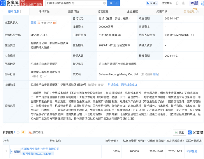 公司设立与股权结构 - 四川和邦矿业有限公司于近日成立 注册资本为20亿元人民币 [1] - 该公司由A股上市公司和邦生物(603077)全资持股 [1] - 公司登记状态为存续 成立日期为2025年11月27日 [2] 公司基本信息 - 公司法定代表人为王曼 注册地址位于四川省乐山市五通桥区 [2] - 公司类型为有限责任公司(非自然人投资或控股的法人独资) [2] - 公司国标行业为其他常用有色金属矿采选 英文名为Sichuan Hebang Mining Co., Ltd. [2] 经营范围 - 公司经营范围涵盖地质勘查技术服务 地质勘查专用设备制造 非金属矿及制品销售 煤炭洗选 [1] - 一般项目包括选矿 专用设备制造 矿山机械制造 贵金属冶炼 稀有稀土金属冶炼 矿物洗选加工 矿产资源储量估算和报告编制服务等 [2] - 许可项目包括矿产资源勘查 非煤矿山矿产资源开采 金属与非金属矿产资源地质勘探 煤炭开采等 [2]