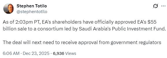 此前在今年9月29日,EA便发文表示将被PIF、Silver Lake及Affinity Partners组成的投资财团以550亿美元的价格收购。股东们将获得每股210美元的现金收 益,这一金额相较于未受影响的股价而言形成了25%的溢价。消息发布后,EA股价亦上升了14.87%,目前维持在200美元左右。 今日(12月23日),外媒游戏记者Stephen Totilo爆料表示,EA(电子艺界)的股东已经正式批准了收购案件进程,将由沙特阿拉伯公共投资基金(PIF) 牵头组成的投资财团以总价550亿美元收购。该交易接下来还需要获得政府监管机构的批准。 另外据华尔街日报在本月月初报道,当收购案顺利通过后,PIF将持有EA 93.4%的股份,Silver Lake和Affinity Partners则分别持有5.5%和1.1%。同时由于 PIF也是Silver Lake和Affinity Partners的重要投资者,所以实际上将完全控制EA公司。 EA旗下的代表作品包括EA SPORTS、《战地》系列、《模拟人生》系列等。其中公司在10月份发文宣布,《战地6》发售后打破了《战地》系列以往的 各项纪录,成为今年最成功 ...