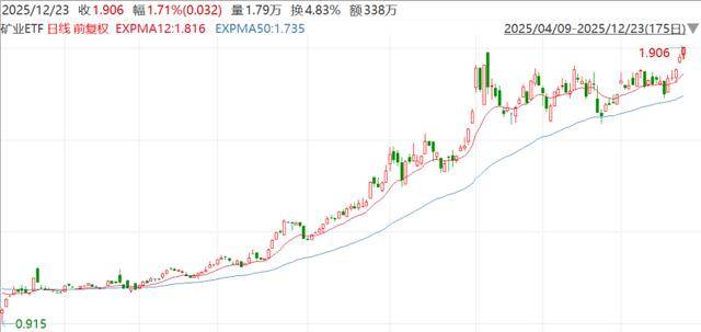 消息面上,金价继续刷新历史新高,首次突破每盎司4465美元,此前一个交易日上涨2.4%,创下一个 多月以来的最大单日涨幅。交易员押注美联储明年将再次降息,低利率环境将对贵金属有利。 今年以来,有色板块持续领跑,年初以来至12月12日,申万一级有色金属指数涨幅86.57%,矿业ETF (159690)跟踪的有色矿业指数年内涨幅达96.13%。 从基本面来看,行业整体盈利能力的提升为板块上行奠定了坚实基础。2025年前三季度,有色金属行业 归母净利润同比增长41.43%,其中,第三季度同比增幅进一步扩大至50.81%。有色矿业指数弹性优势 更大,前三季度、单季度归母净利润分别为49.48%、55.62%。 | 指数 | 润增长率(%) | 第三季度归母净利 前三季度归母净利 平均ROE(%) 润增长率(%) 润增长率(%) | | | --- | --- | --- | --- | | 有色矿业 | 55.62 | 49.48 | 12.14 | | 有色金属(申万) | 50.81 | 41.43 | 10.61 | | 沪深300 | 10.43 | 5.22 | 8.01 | | SSH黄金股票 | 48. ...