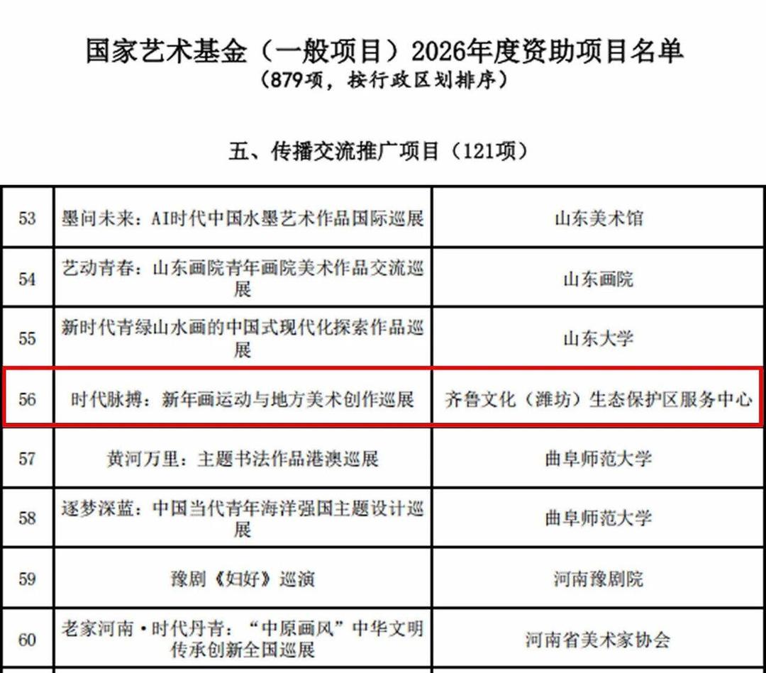 齐鲁晚报·齐鲁壹点 吴昊 | 53 | 墨问未来:AI时代中国水墨艺术作品国际巡展 | 山东美术馆 | | --- | --- | --- | | 54 | 艺动青春:山东画院青年画院美术作品交流巡 | 山东画院 | | | 展 | | | 55 | 新时代青绿山水画的中国式现代化探索作品巡 展 | 山东大学 | | 56 | 时代脉搏:新年画运动与地方美术创作巡展 | 齐鲁文化(潍坊)生态保护区服务中心 | | 57 | 黄河万里:主题书法作品港澳巡展 | 曲阜师范大学 | | 58 | 逐梦深蓝:中国当代青年海洋强国主题设计巡 | 曲阜师范大学 | | | 展 | | | 59 | 像剧《妇好》巡演 | 河南橡刷院 | | 60 | 老家河南 · 时代丹青:"中原画风"中华文明 | 河南省美术家协会 | | | 传承创新全国巡展 | | 该项目将在2026年至2027年启动全国巡展,赴江苏、河南、广东、重庆等多个省市进行交流展示。这不仅是一次艺术作品的集中呈现,更是潍坊文化形象 和城市魅力的重要推广,对提升齐鲁文化(潍坊)生态保护区的知名度和影响力,促进地域文化对话互鉴具有重要意义。 国家艺术基金是经国务 ...