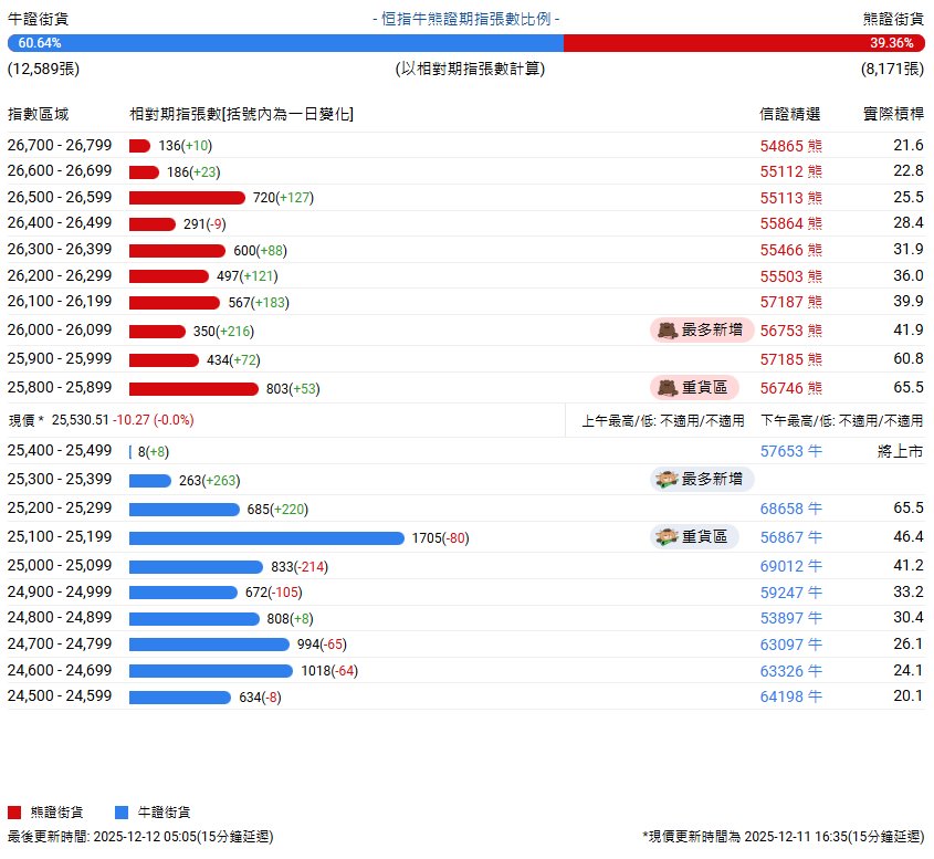 | 牛證街貨 | | | - 恒指牛熊證期指張數比例 - | | | 熊證街貨 | | --- | --- | --- | --- | --- | --- | --- | | 60.64% | | | | | | 39.36% | | (12,589張) | | | (以相對期指張數計算) | | | (8,171張) | | 指數區域 | | 相對期指張數[括號內為一日變化] | | | 信證精選 | 實際槓桿 | | 26,700 - 26,799 | 136(+10) | | | | 54865 能 | 21.6 | | 26,600 - 26,699 | 186(+23) | | | | 55112 能 | 22.8 | | 26,500 - 26,599 | | 720(+127) | | | 55113 HE | 25.5 | | 26,400 - 26,499 | 291(-9) | | | | 55864 能 | 28.4 | | 26.300 - 26.399 | | 600(+88) | | | 55466 龍 | 31.9 | | 26,200 - 26,299 | | 497(+121 ...