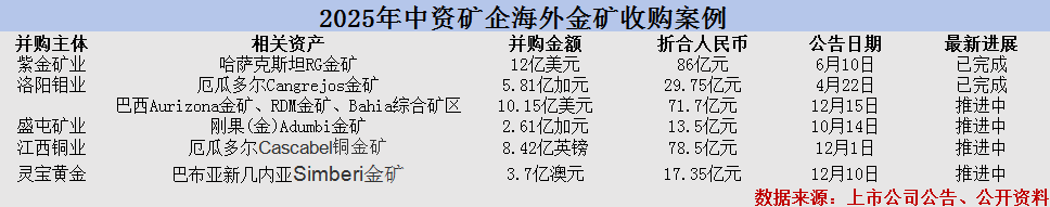 当进入商品价格上涨周期时,行业的整体交投活跃度便会迅速提升。 12月22日,国际金价续创历史新高。截至发稿前,伦敦金现货已经超越今年10月高点,最高价达到4420美元/盎司,年内涨幅进一步扩大至68%左右。 今年不断创出新高的金价,也吸引了更多的企业加大投资,仅今年12月便已经有江西铜业(600362.SH)、灵宝黄金(3330.HK)和洛阳钼业(603933.SH) 三家中资企业宣布收购海外黄金矿山等资产。 | | | 2025年中资矿企海外金矿收购案例 | | | | | --- | --- | --- | --- | --- | --- | | 并购主体 | 相关资产 | 并购金额 | 折合人民币 | 公告日期 | 最新进展 | | 紫金矿业 | 哈萨克斯坦RG全矿 | 12亿美元 | 86亿元 | 6月10日 | 己完成 | | 洛阳铝业 | 厄瓜多尔Cangrejos金矿 | 5.81亿加元 | 29.75亿元 | 4月22日 | 己完成 | | | 巴西Aurizona金矿、RDM金矿、Bahia综合矿区 | 10.15亿美元 | 71.7亿元 | 12月15日 | 推进中 | | 感电矿业 | ...