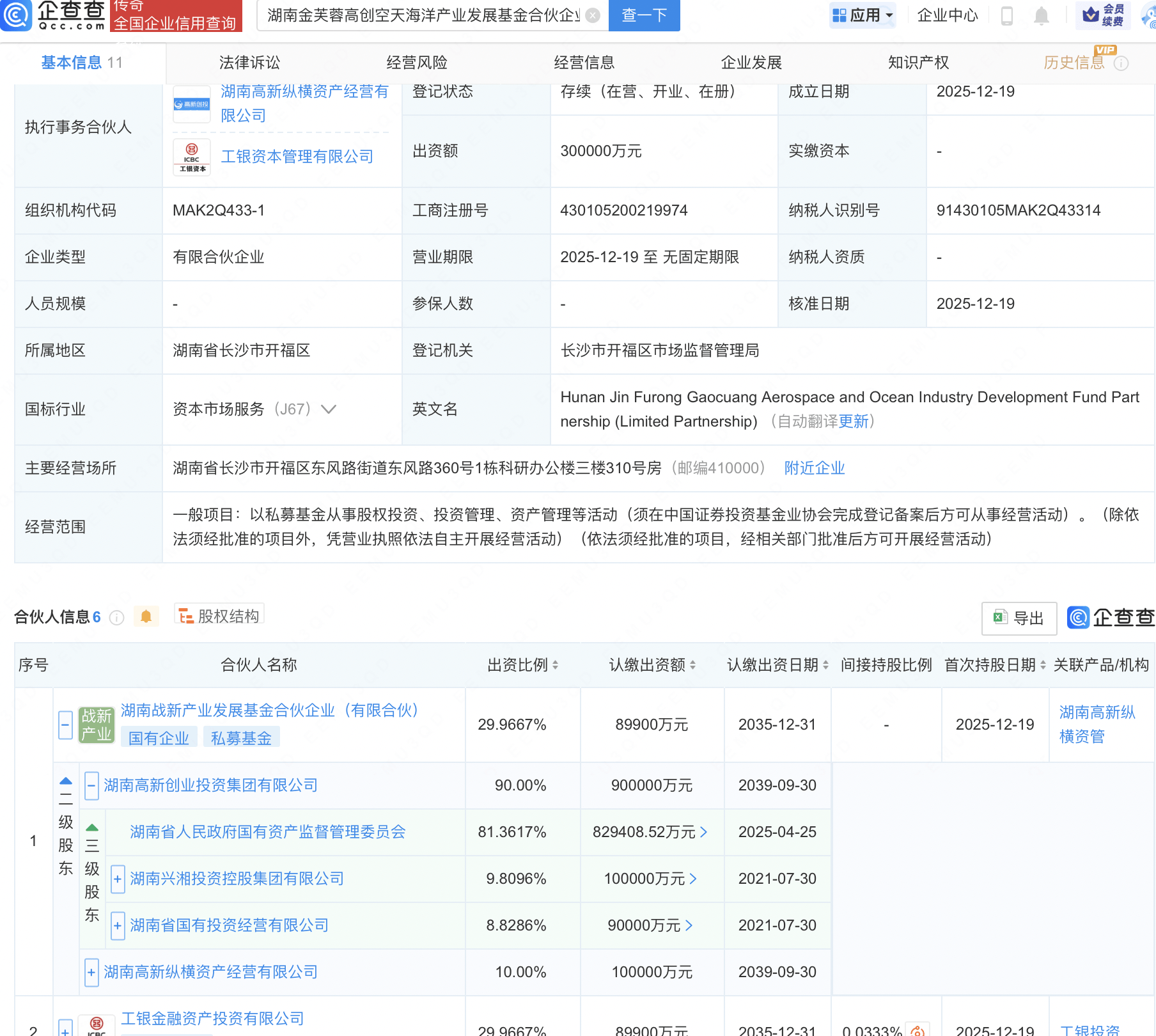 企查查APP显示,近日,湖南金芙蓉高创空天海洋产业发展基金合伙企业(有限合伙)成立,出资额30亿元,经营范围包含:以私募基金从事股权投资、投 资管理、资产管理等活动。企查查股权穿透显示,该企业由湖南战新产业发展基金合伙企业(有限合伙)、工银金融资产投资有限公司等共同出资。 | 基本信息 11 | 法律诉讼 经营风险 | | 经营信息 | | --- | --- | --- | --- | | 执行事务合伙人 | 湖南高新纵横资产经营有 限公司 | 登记状态 | 存续(在营、开业、 | | | 工银资本管理有限公司 | 出资额 | 300000万元 | | 组织机构代码 | MAK2Q433-1 | 工商注册号 | 430105200219974 | | 企业类型 | 有限合伙企业 | 营业期限 | 2025-12-19 至 无固示 | | 人员规模 | | 参保人数 | | | 所属地区 | 湖南省长沙市开福区 | 登记机关 | 长沙市开福区市场监 | | 国标行业 | 资本市场服务 (J67) ∨ | 英文名 | Hunan Jin Furong Ga | | | | | nership (Limited ...