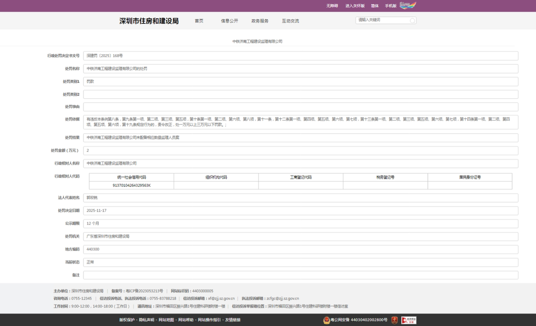 公司受罚事件 - 中铁济南工程建设监理有限公司于2025年11月17日收到深圳市住房和建设局的行政处罚,罚款人民币2万元整,案由为“未配备相应数量监理人员案”,行政处罚决定书文号为深建罚〔2025〕168号 [1] - 该公司近期在中国招标投标公共服务平台的信息显示,其参与了河南城际铁路有限公司、山东济铁建设咨询有限公司等单位的招采活动,并中标了烟台市城市快速路红旗路高架桥工程上跨蓝烟等铁路修建立交桥工程施工监理招标项目 [1] 公司背景与资质 - 中铁济南工程建设监理有限公司是中铁工程设计咨询集团有限公司的全资子公司 [4][7] - 公司成立于1995年01月25日,注册资本为1000万元人民币,法定代表人为郭宏锐(或郭宏锡/郭宏娟,原文信息不一致),登记状态为在营(开业) [5][7] - 公司具有铁路工程、市政公用工程、房屋建筑工程三项监理甲级资质及造价咨询甲级资质,业务范围包括工程监理服务、工程造价咨询、工程项目管理等 [4][5] - 公司自成立以来,承担了多项国家铁路、市政、公路重点工程,例如新建铁路武汉至广州客运专线武汉至花都段工程、胶济铁路电气化工程、广州市轨道交通五号线7标段土建工程等 [4] 股权结构与注册信息 - 公司由中铁工程设计咨询集团有限公司100%全资持股,股东类型为企业法人 [5][7] - 公司注册机关为济南市历城区市场监督管理局,住所位于济南市历城区经十路25666号 [5]
