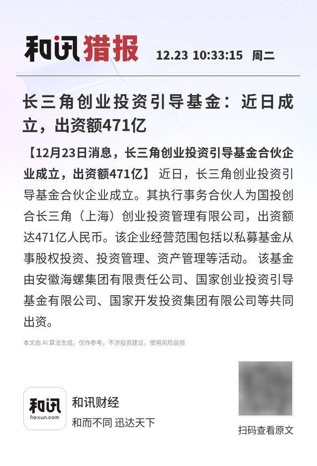 基金成立概况 - 近日,长三角创业投资引导基金合伙企业(有限合伙)成立,执行事务合伙人为国投创合长三角(上海)创业投资管理有限公司 [1] - 基金出资额高达471亿人民币 [1] - 基金经营范围为以私募基金从事股权投资、投资管理、资产管理等活动 [1] 出资方构成 - 基金由安徽海螺集团有限责任公司、国家创业投资引导基金有限公司、国家开发投资集团有限公司等共同出资 [1]