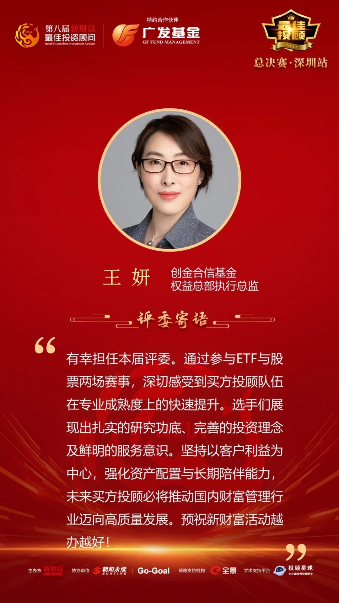 第八届新财富最佳投顾评选已圆满落下帷幕。在"服务能力评价"阶段,新财富在成都、北京、深圳、上海四地展开"最佳投顾总决赛"。54位来自证券公 司、公募基金、私募基金及第三方机构的资深评委,通过严谨的现场评审与深度答辩,最终评选出91位行业标杆代表。 评审过程中,评委们不仅严格把关,也从专业进阶、服务转型与行业趋势等多重维度,分享了他们的观察、思考与期待。本文将汇集部分评委的现场寄语 (排名不分先后,按机构首字母排序),与读者一同聆听行业前沿的声音。 【上篇回顾】 《第八届新财富投顾评选评委寄语集锦:真正的投顾,从不只有一种答案》 度和专业度在迅速提升。参赛选手均展现出较高的研究水准、较为完善的投资理念、以及较强的客户服务意识。以客户利益为核心,以资产配置与长期陪 伴为核心能力,未来买方投顾队伍必然推动国内财富管理行业进入高质量发展阶段。预祝新财富越办越好! 创金合信基金权益总部执行总监王妍:非常有幸担任此次新财富投顾总决赛的评委,通过参加了ETF和股票两场比赛,深深的感受到买方投顾队伍的成熟 淳阳基金董事长兼投资总监谢伟玉:投顾老师们专业度和对客户的热忱让人感动,期待能通过上市公司调研加强深度、AI跟踪基本面加 ...