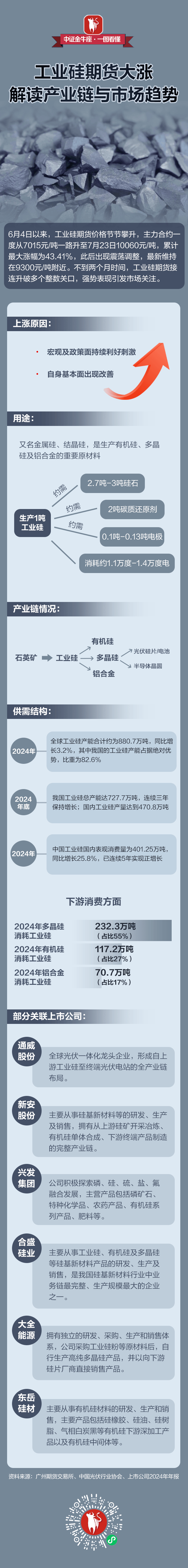 中证金牛座 智能 工业硅期货大涨 解读产业链与市场趋势 6月4日以来,工业硅期货价格节节攀升,主力合约一 度从7015元/吨一路升至7月23日10060元/吨,累计 最大涨幅为43.41%,此后出现震荡调整,最新维持 在9300元/吨附近。不到两个月时间,工业硅期货接 连升破多个整数关口,强势表现引发市场关注。 ┣涨值因: 宏观及政策面持续利好刺激 • 自身基本面出现改善 • 用途: 又名金属硅、结晶硅,是生产有机硅、多晶 硅及铝合金的重要原材料 2.7吨-3吨硅石 些需 2吨碳质还原剂 生产1吨 约需 工业硅 0.1吨-0.13吨电极 消耗约1.1万度-1.4万度电 产业链情况: 有机硅 才光伏硅片/电池 石英矿 ⇒ 工业硅 -> 多晶硅 > 半导体晶圆 ,铝合金 供需结构: 全球工业硅产能合计约为880.7万吨,同比增 长3.2%,其中我国的工业硅产能占据绝对优 2024年 势,比重为82.6%。 我国工业硅总产能达727.7万吨,连续三年 2024 年底 保持增长;国内工业硅产量达到470.8万吨 中国工业硅国内表观消费量为401.25万吨, 2024年 同比增长25.8%,已连续5年实现正增长 下游消 ...