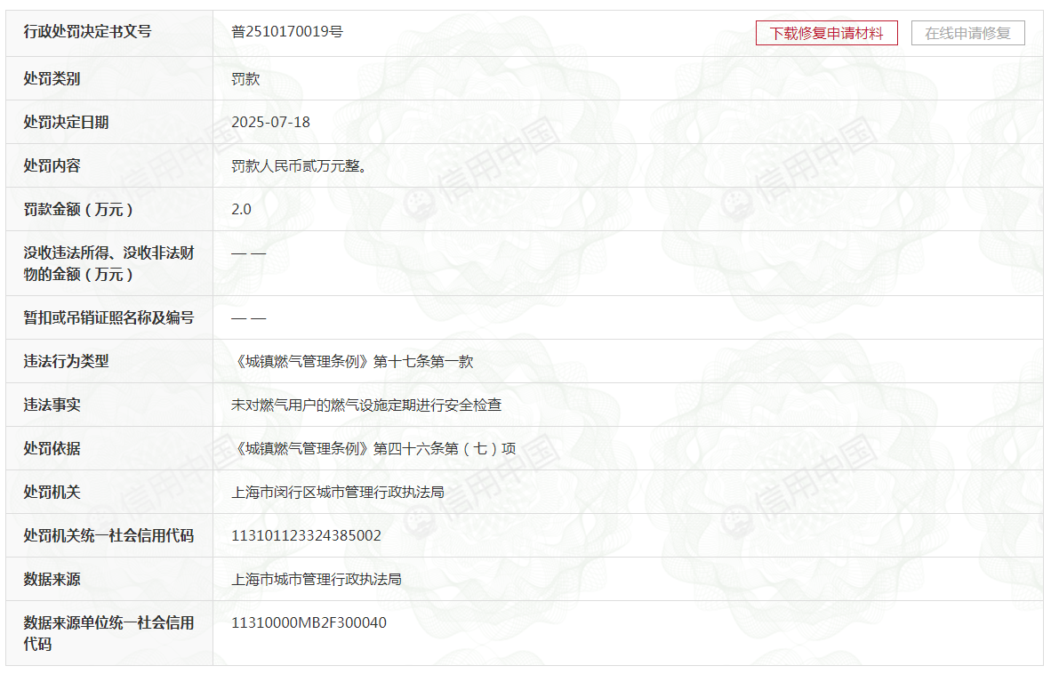 公司行政处罚概况 - 上海百斯特能源发展有限公司于2025年7月18日因未对燃气用户的燃气设施定期进行安全检查被处以罚款人民币2万元 [1][2] - 公司在2025年已累计收到3张罚单,罚款总金额为人民币22.48万元 [2] - 2025年3月5日,公司因违反操作规程或者安全管理规定从事作业被罚款人民币1.5万元 [2][3] - 2025年1月13日,公司因在不具备安全条件的场所储存燃气、对气瓶和相关设备管理不符合规定、不按照燃气经营许可证的规定从事经营活动等多项行为被罚款人民币18.98万元 [2][4] 公司基本信息 - 上海百斯特能源发展有限公司成立于1998年5月22日,注册资本为4729.0427万元,法定代表人为李晓影 [4] - 公司是喜威(中国)投资有限公司的全资子公司 [4] - 喜威(中国)投资有限公司是国内领先的能源企业,主要从事液化石油气与新能源业务 [6] - 截至2025年,喜威公司在珠江三角洲及长江三角洲区域拥有30多家成员企业,员工超过3100名,年销量超过40万吨 [6]