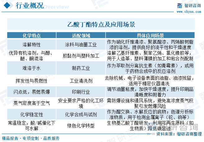 内容概况:国内产能通过技术升级和新增装置持续提升,头部企业依托规模化生产与产业链整合优势主 导市场供应,但下游需求增长相对滞后,主要依赖涂料、油墨等传统领域,新兴应用如医药萃取、高端 溶剂等尚未形成规模支撑。环保政策趋严推动行业向绿色生产工艺转型,但产能结构性过剩问题突出, 产能利用率长期低位运行,供需矛盾持续加剧。数据显示,2024年我国乙酸丁酯产量81万吨,需求量 62.8万吨。 关键词:乙酸丁酯产量 乙酸丁酯需求量 乙酸丁酯进口量 乙酸丁酯出口量 一、乙酸丁酯产业发展概述 乙酸丁酯,又名醋酸丁酯、乙酸正丁酯等,是一种具有水果香味的无色透明可燃性液体,其香味比乙酸 戊酯略小。以其优异的溶解性(与醇、醚、酮混溶,难溶于水)、显著的易燃易爆性(低闪点和高蒸气 密度)及常温下的化学稳定性为主要特点。在应用上,它广泛用于涂料油墨工业、胶黏剂与塑料加工、 制药业、工业清洗、印刷行业,以及安全要求严格的化工厂;此外,在化学合成中作为反应底物和色谱 分析标准物,同时通过生物基研发推动绿色转型,覆盖多领域但以溶剂角色为主。 | 乙酸 脂符点及应用功京 | | | | --- | --- | --- | | 化学特点 | ...