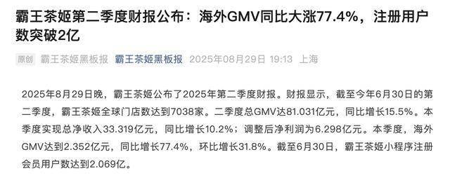核心财务表现 - 2025年第二季度总净收入33.319亿元人民币,同比增长10.2% [2] - 全球GMV达81.031亿元,同比增长15.5% [2] - 毛利率提升至53.9%,显示规模效应与供应链优化成效 [2] - 上半年经调整净利润13亿元,同比增长6.8% [7] 全球化进展 - 海外市场GMV达2.352亿元,同比大涨77.4%,环比增长31.8% [2][3] - 海外门店扩展至208家,覆盖马来西亚(178家)、新加坡(16家)、印尼(8家)、泰国(5家)、美国(1家)五大市场 [3] - 北美市场组建专业管理团队:Emily Chang任首席商务官,Aaron Harris任首席发展官 [4] - 美国洛杉矶首店创下单日5000杯销售纪录,维持日均1000杯水平 [4] 会员与复购表现 - 注册会员数突破2亿达2.069亿人,季度净增1455万,同比增长42.7% [2][6] - 73.9%订单来自用户复购行为,外卖GMV占比逆势提升至52% [6] 产品与运营策略 - 坚持高价值品牌策略,拒绝参与短期折扣活动 [2][6] - 新品"一骑红尘"首周销售亮眼,与回归产品"夏梦玫珑"共同推动GMV环比提升 [6] - 海外爆款"谷香焙茶"在东南亚成为现象级产品,推动品牌登顶声量榜 [3] - 与大英图书馆联名伯爵茶系列显著提升新加坡市场销售杯量 [3] 区域市场表现 - 大中华区单店月均GMV为40.435万元,同店GMV同比下降23%,主要因2024年同期基数过高及客源分流 [6] - 新加坡门店日均销量稳定在1500杯以上,马来西亚178家门店盈利能力超预期 [4] - 印尼开业活动吸引3.5万新会员,泰国门店开业三日新增1.5万会员 [4] 战略布局 - 下半年将启动核心原料全面升级计划,涵盖茶叶、奶源、糖浆等品类 [7] - 海外本土化团队建设成效显著,成熟市场单店盈利模型持续优化 [3][4]