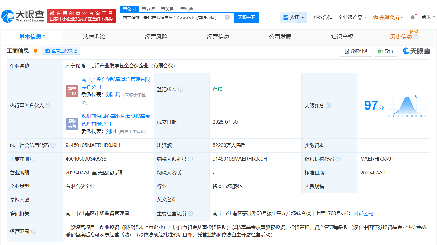 南宁强链一号铝产业发展基金登记成立 出资额8.22亿