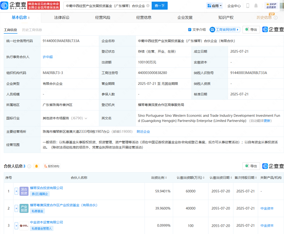 基金成立信息 - 中葡中西经贸产业发展投资基金(广东横琴)合伙企业(有限合伙)于2025年7月21日成立,出资额10.01亿元人民币 [1][2] - 基金类型为有限合伙企业,营业期限为无固定期限,登记状态为存续 [2] - 基金注册地址为广东省珠海市香洲区横琴新区港澳大道2333号8栋1907办公 [2] 股东结构 - 横琴深合投资有限公司持股59.9401%,认缴出资6亿元人民币 [3] - 横琴粤澳深度合作区产业投资基金(有限合伙)持股39.9600%,认缴出资4亿元人民币 [3] - 中金资本运营有限公司持股0.0999%,认缴出资100万元人民币 [3] 经营范围 - 以私募基金从事股权投资、投资管理、资产管理等活动 [1][2] - 以自有资金从事投资活动 [1] - 需在中国证券投资基金业协会完成登记备案后方可开展经营活动 [2] 工商信息 - 统一社会信用代码为91440003MAERBLT33A [2] - 执行事务合伙人为许中超 [2] - 登记机关为横琴粤澳深度合作区商事服务局 [2] - 国标行业分类为其他资本市场服务(J6790) [2]