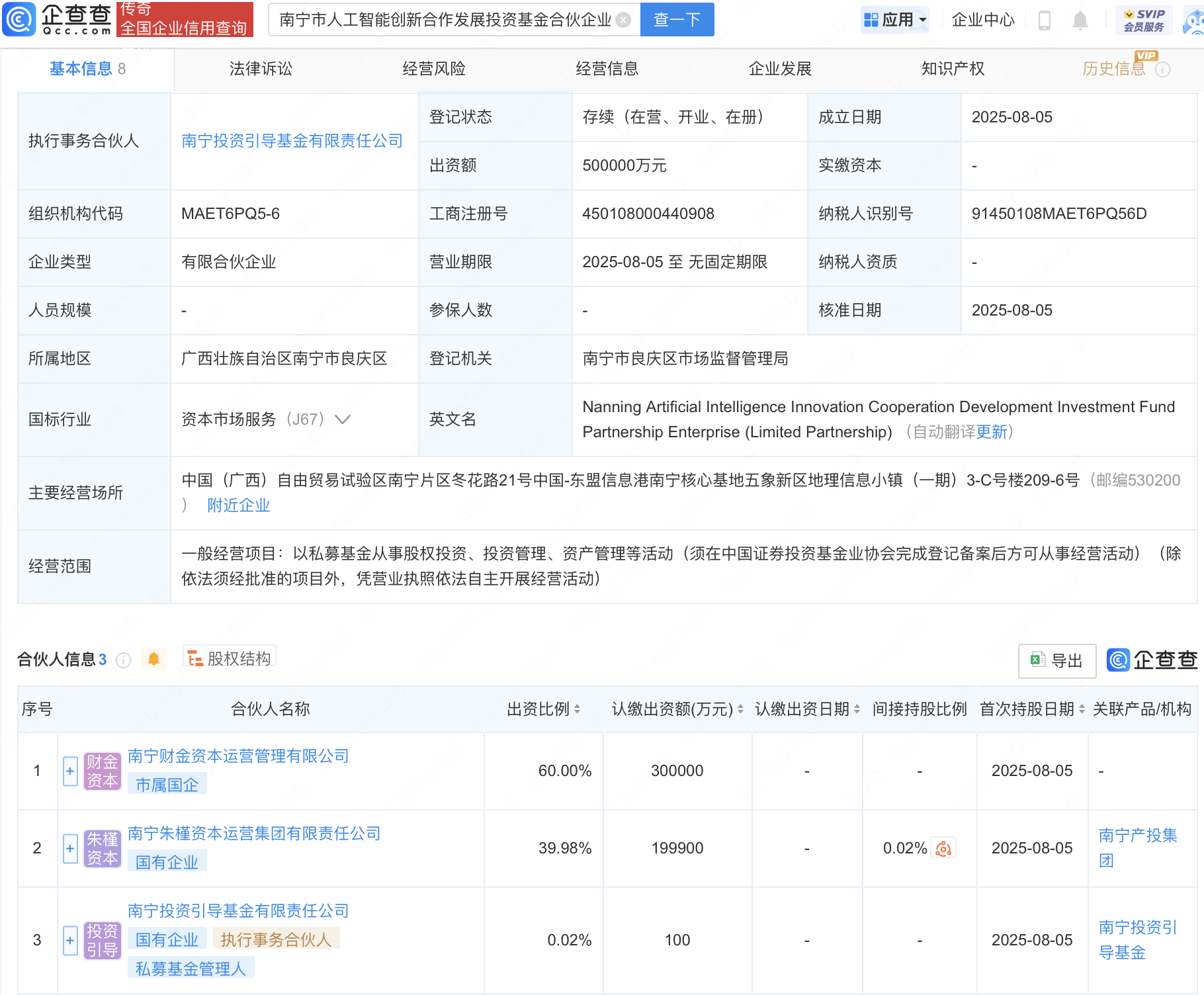 | 序号 | | | 合伙人名称 | 出资比例 ⇒ | 认缴出资额(万元 | | --- | --- | --- | --- | --- | --- | | 1 | + | 顺舍 | 南宁财金资本运营管理有限公司 | 60.00% | 300000 | | | | 资本 | 市属国企 | | | | 2 | + | 朱槿 | 南宁朱槿资本运营集团有限责任公司 | 39.98% | 199900 | | | | 资本 | 国有企业 | | | | 3 | + | 더 글 | 南宁投资引导基金有限责任公司 国有企业 执行事务合伙人 | 0.02% | 100 | | | | | 私募基金管理人 | | | 企查查APP显示,近日,南宁市人工智能创新合作发展投资基金合伙企业(有限合伙)成立,出资额50亿元,经营范围包含:以私募基金从事股权投资、投 资管理、资产管理等活动。企查查股权穿透显示,该企业由南宁财金资本运营管理有限公司等共同出资。 | 全国企业信用查询 | | 南宁市人工智能创新合作发展投资基金合伙企业 ◎ | 查一下 | | --- | --- | --- | --- | | 基本信息 8 | 法律诉讼 ...
