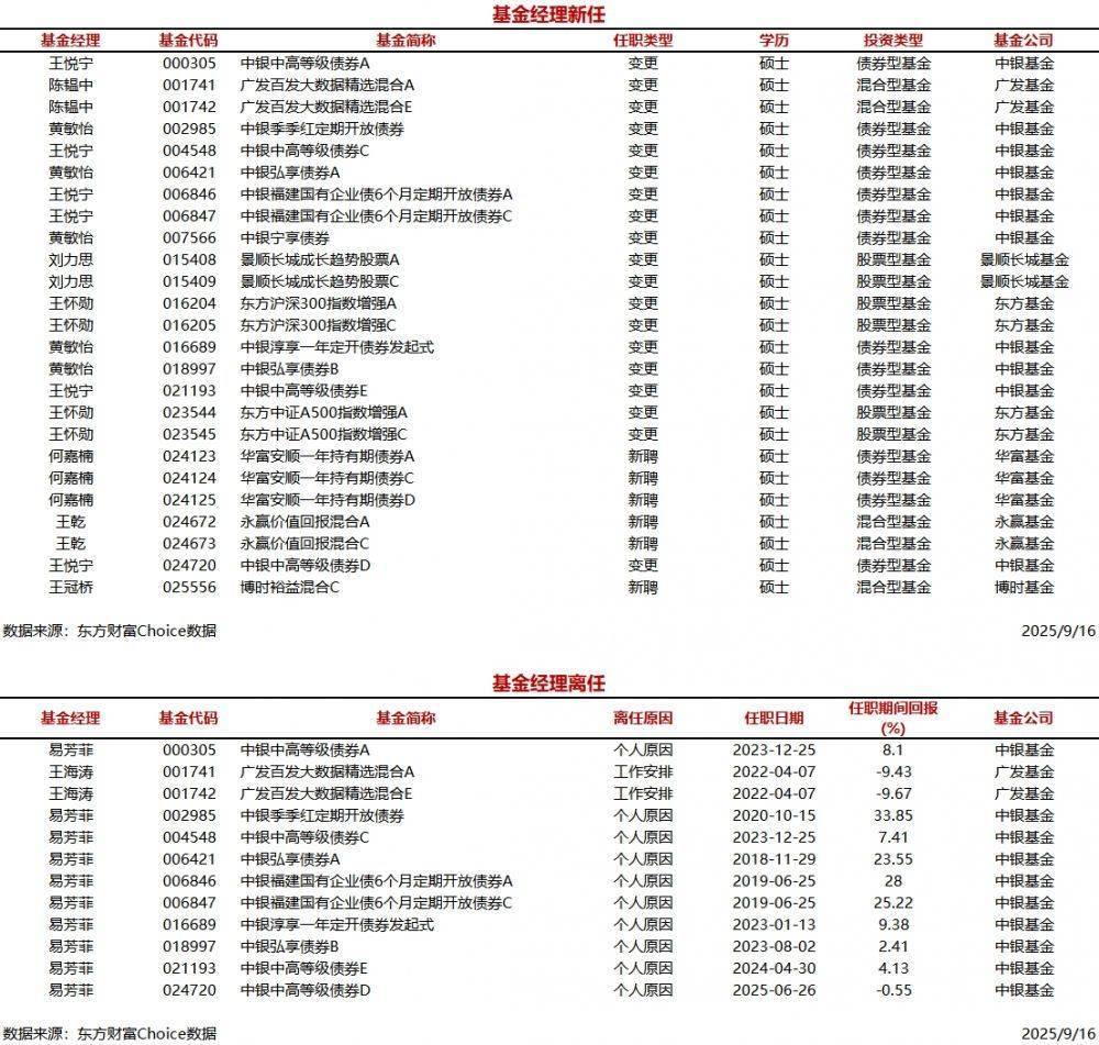 | | | | 本市市分子市场地 | | | | | --- | --- | --- | --- | --- | --- | --- | | 具金经理 | 其金代码 | 其金简称 | 任服务型 | 学历 | 投资类型 | 其金公司 | | 王悦宁 | 000305 | 中银中高等级债券A | 委员 | 硕士 | 债券型高全 | 中規真令 | | 陈福中 | 001741 | 广发百发大数据精选混合A | कुल | 硕士 | 混合型基金 | 广发基金 | | 陈揚中 | 001742 | 广发自发大数据精选混合E | के न | 硕士 | 混合型基金 | 广发基金 | | 黄敏怡 | 002985 | 中银季季红定期开放债券 | 变更 | 硕士 | 债券型基金 | 中银基金 | | 王悦宁 | 004548 | 中银中高等级债券C | 夢 | 硕士 | 债券型基金 | 中領其全 | | 章敏怡 | 006421 | 中银引享债券A | 李即 | 硕士 | 借券型其全 | 中相其寺 | | 王悦宁 | 006846 | 中银福建国有企业债6个月定期开放债券A | 委员 | 硕士 | 债券型具全 | 中相其寺 ...