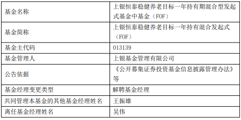 | 基金名称 | 上银恒泰稳健养老目标一年持有期混合型发起 | | --- | --- | | | 式基金中基金(FOF) | | 基金简称 | 上银恒泰稳健养老目标一年持有混合发起式 (FOF) | | 基金主代码 | 013139 | | 基金管理人 | 上银基金管理有限公司 | | 公告依据 | 《公开募集证券投资基金信息披露管理办法》 等 | | 基金经理变更类型 | 解聘基金经理 | | 共同管理本基金的其他基金经理姓名 | 王振雄 | | 离任基金经理姓名 | 吴伟 | | 基金名称 | 上银恒容养老目标日期2045三年持有期混合型 | | --- | --- | | | 发起式基金中基金(FOF) | | 基金简称 | 上银恒容养老目标日期2045三年持有混合发起 式(FOF) | | 基金主代码 | 017004 | | 基金管理人 | 上银基金管理有限公司 | | 公告依据 | 《公开募集证券投资基金信息披露管理办法》 等 | | 基金经理变更类型 | 解聘基金经理 | | 共同管理本基金的其他基金经理姓名 | 王振雄 | | 离任基金经理姓名 | 吴伟 | 中国经济网北京9月16日讯昨日, ...
