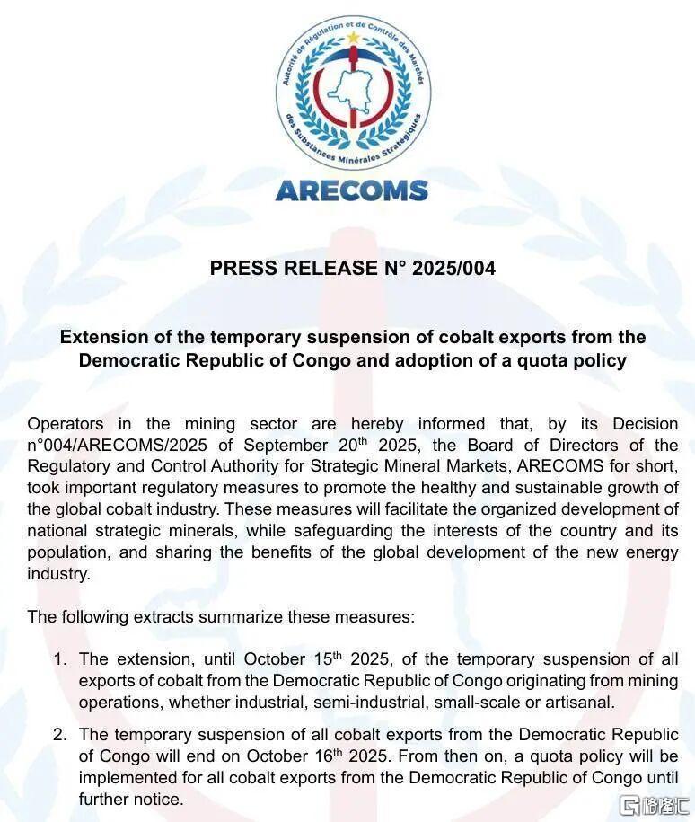 刚果(金)一纸公告,全球钴市场格局震动。 9月21日晚,刚果(金)战略矿产市场监管控制局(ARECOMS)宣布将原定9月21日到期的出口禁令继续延期 到10月15日,并将于10月16日解除钴出口禁令,实施年度出口配额。 从出口禁令到配额制度 今年2月,钴价暴跌之际,刚果(金)首次宣布为期四个月的钴出口禁令,并在6月延长禁令三个月。 此次最新公告宣布,将原定9月21日到期的禁令将继续延长至10月15日,而自10月16日起,钴出口将进入配额 管理阶段。 根据新规,矿商在今年剩余时间内的出口配额将略高于1.8万吨,2026年和2027年每年的配额上限设定为9.66 万吨。 据Darton Commodities数据显示,刚果(金)2024年钴产量约22万吨,占全球总产量的约四分之三。 ARECOMS主席Patrick Luabeya在接受媒体采访时直言,当前局势"已不再需要全面暂停出口"。 他指出,新的配额制度将在未来几个月内"为未来数年的市场再平衡完成最后的调整"。该政策的明确目标是 将全球钴库存削减至"约相当于一个月需求量"的水平。 钴价半年飙涨超60% 自2月禁令实施以来,钴的价格一路飙升。 数据显示,202 ...