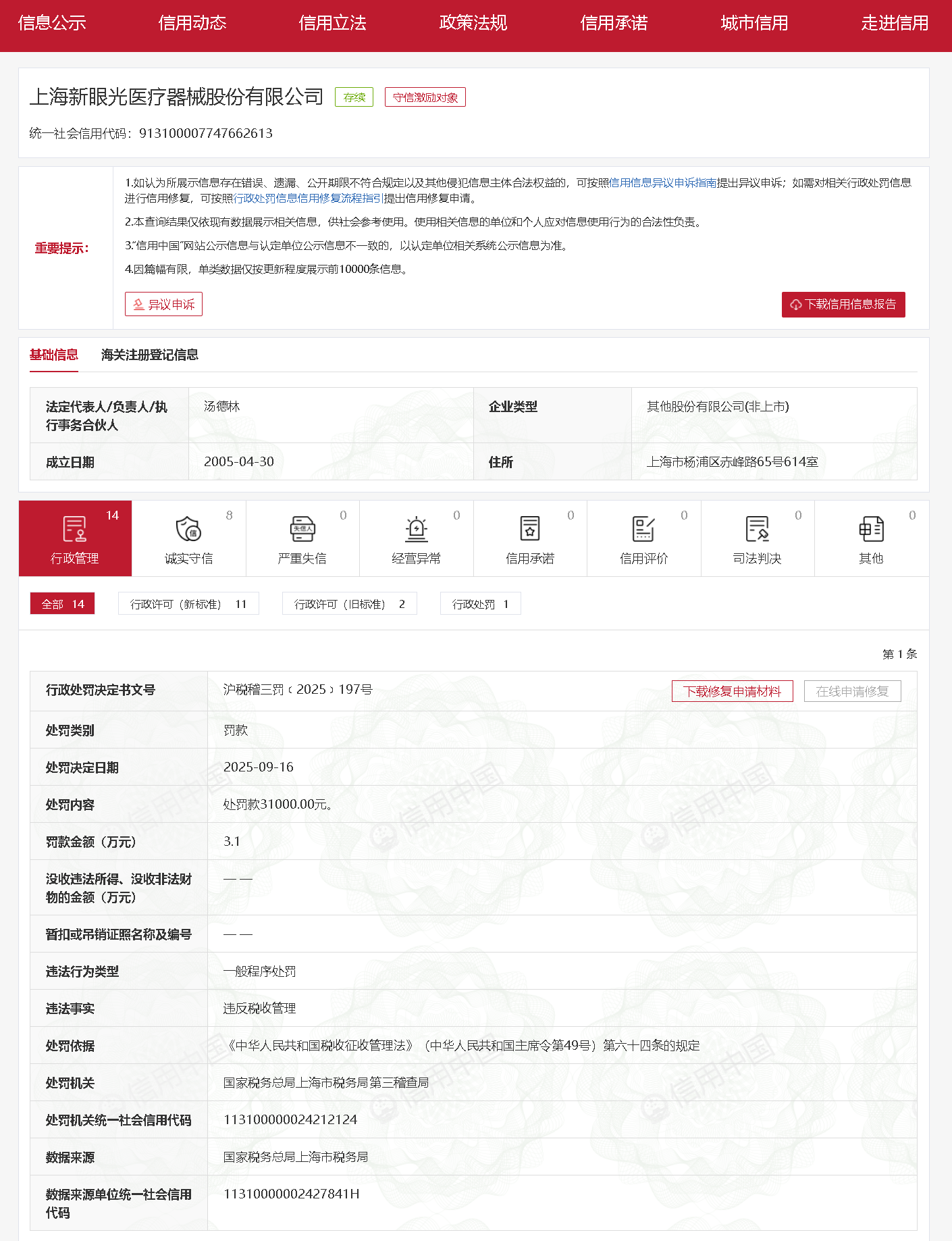 违反税收管理,上海新眼光医疗器械股份有限公司被罚