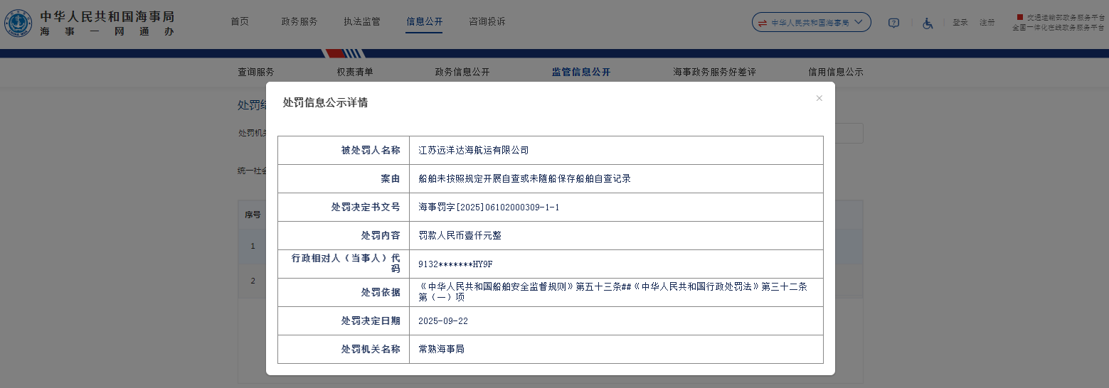 因这项案由,江苏远洋达海航运有限公司收海事罚单