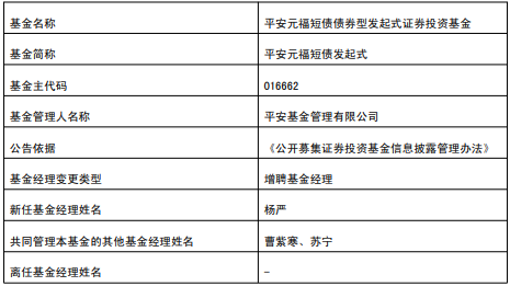 | 基金名称 | 平安元福短债债券型发起式证券投资基金 | | --- | --- | | 基金简称 | 平安元福短债发起式 | | 基金主代码 | 016662 | | 基金管理人名称 | 平安基金管理有限公司 | | 公告依据 | 《公开募集证券投资基金信息披露管理办法》 | | 基金经理变更类型 | 增聘基金经理 | | 新任基金经理姓名 | 杨严 | | 共同管理本基金的其他基金经理姓名 | 曹紫寒、苏宁 | | 离任基金经理姓名 | | (责任编辑:康博) 中国经济网北京9月15日讯 近日,平安基金公告,平安元福短债发起式增聘杨严。 杨严曾任招商银行浙江省分行国际业务部职员、民生通惠资产管理公司信用研究员、德邦基金管理 有限公司信用基金经理、长安基金管理有限公司基金经理。2024年12月加入平安基金管理有限公司。 平安元福短债发起式A/C成立于2022年11月8日,截至2025年9月12日,其今年来收益率为1.14%、 0.93%,成立来收益率为8.38%、7.41%,累计净值为1.0838元、1.0741元。 ...